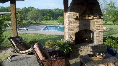 Outdoor living area with fireplace, patio and pool